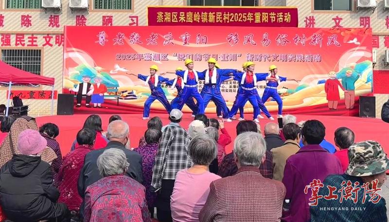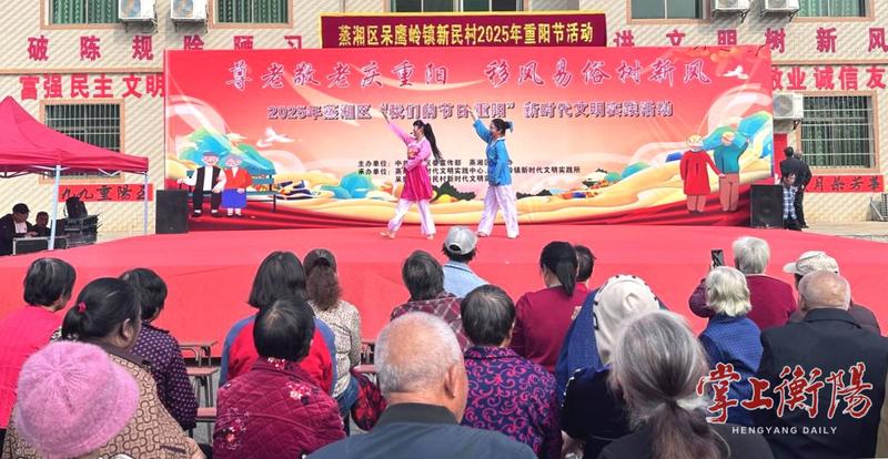 重阳佳节将至,10月28日,衡阳市蒸湘区新时代文明实践中心联合呆鹰岭镇新时代文明实践所在新民村举办“尊老敬老庆重阳 移风易俗树新风”主题活动,以文艺演出传递孝道温情,以文明实践倡树时代新风。