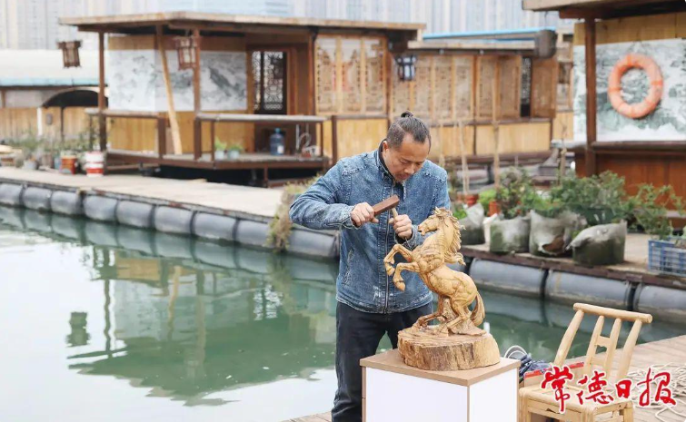 潘能辉在穿紫河畔进行雕刻创作。 常德日报记者 潘敬林 张顺 摄