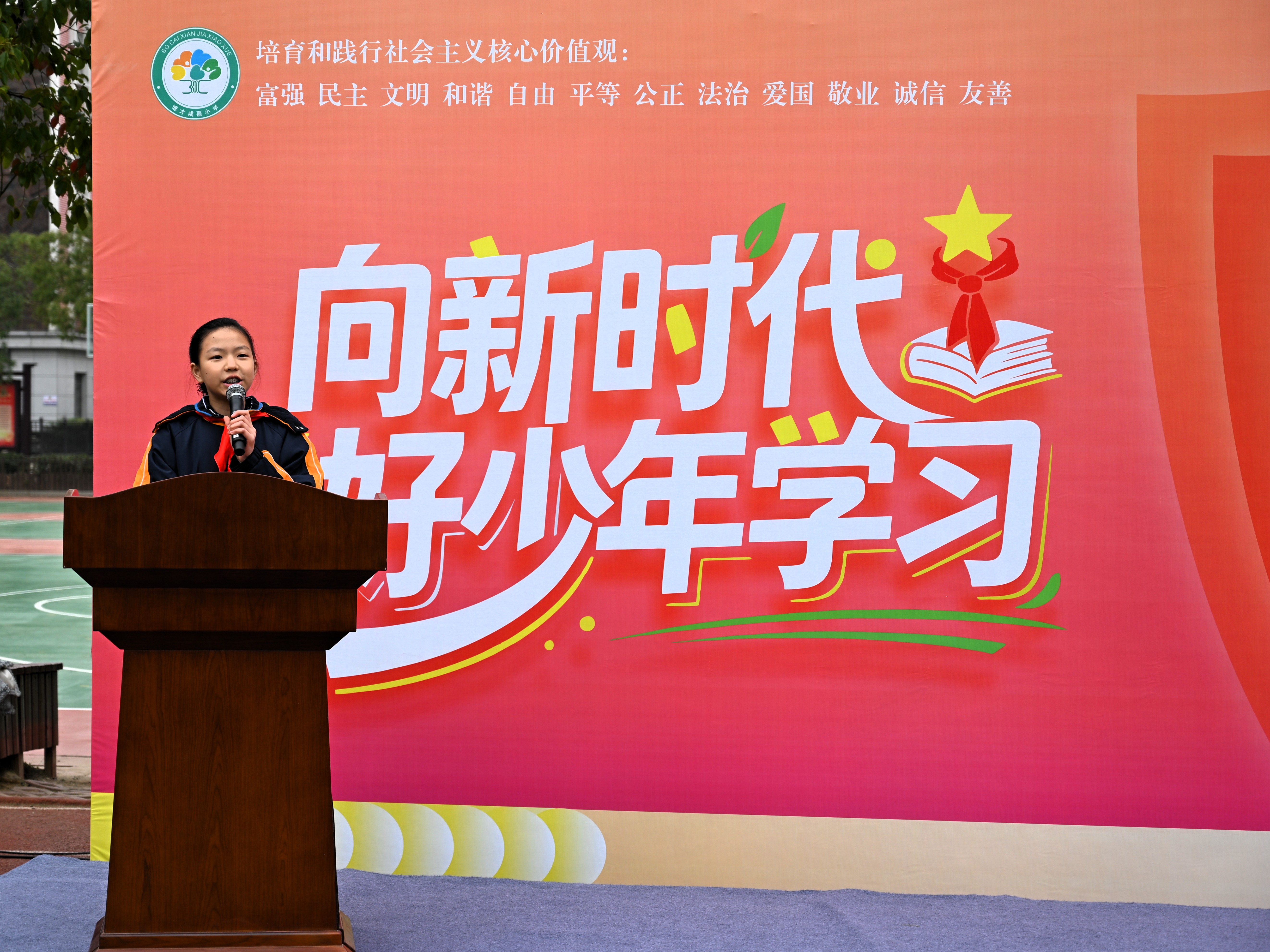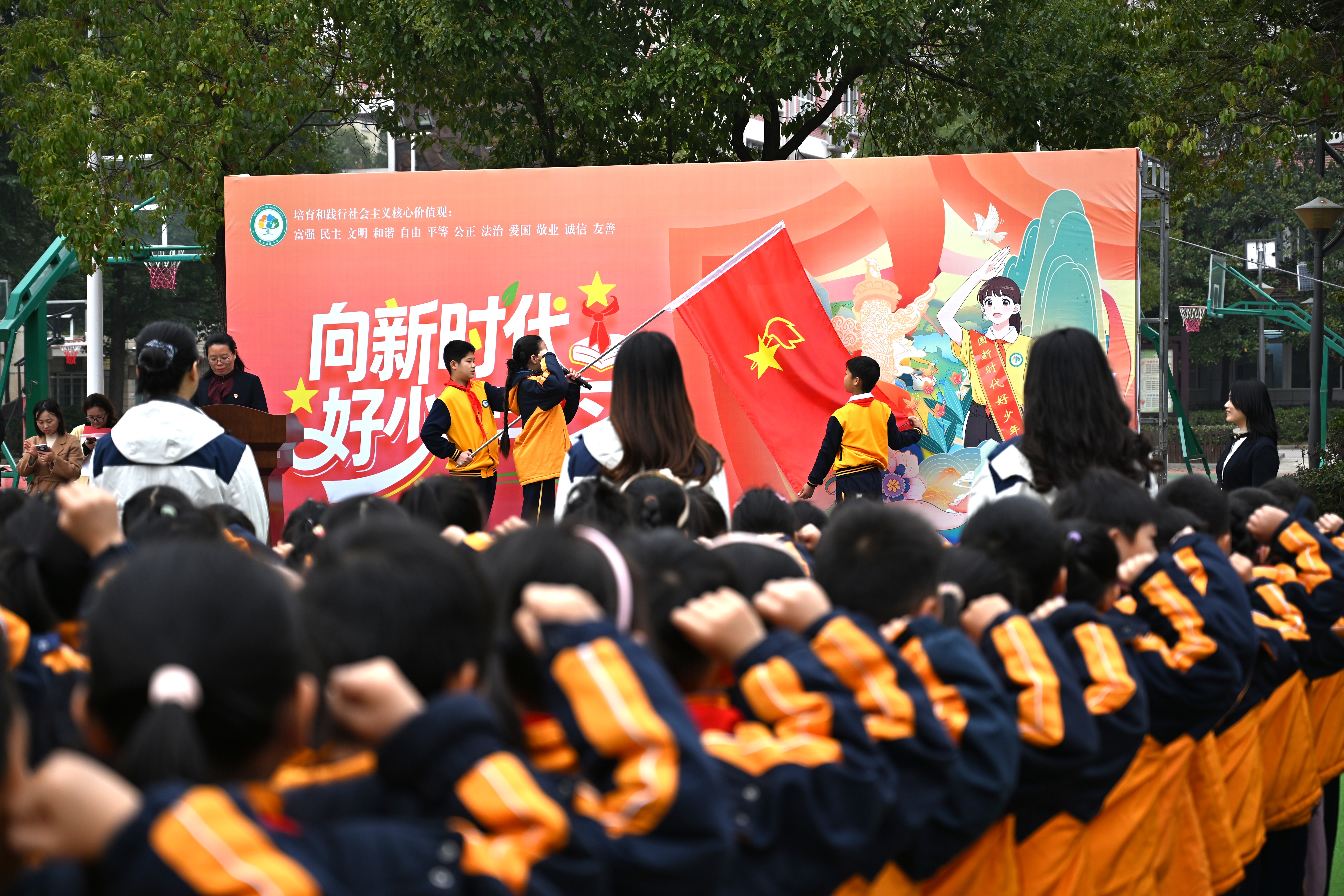 学校全体学生跟随刘静远重温少先队入队誓词。