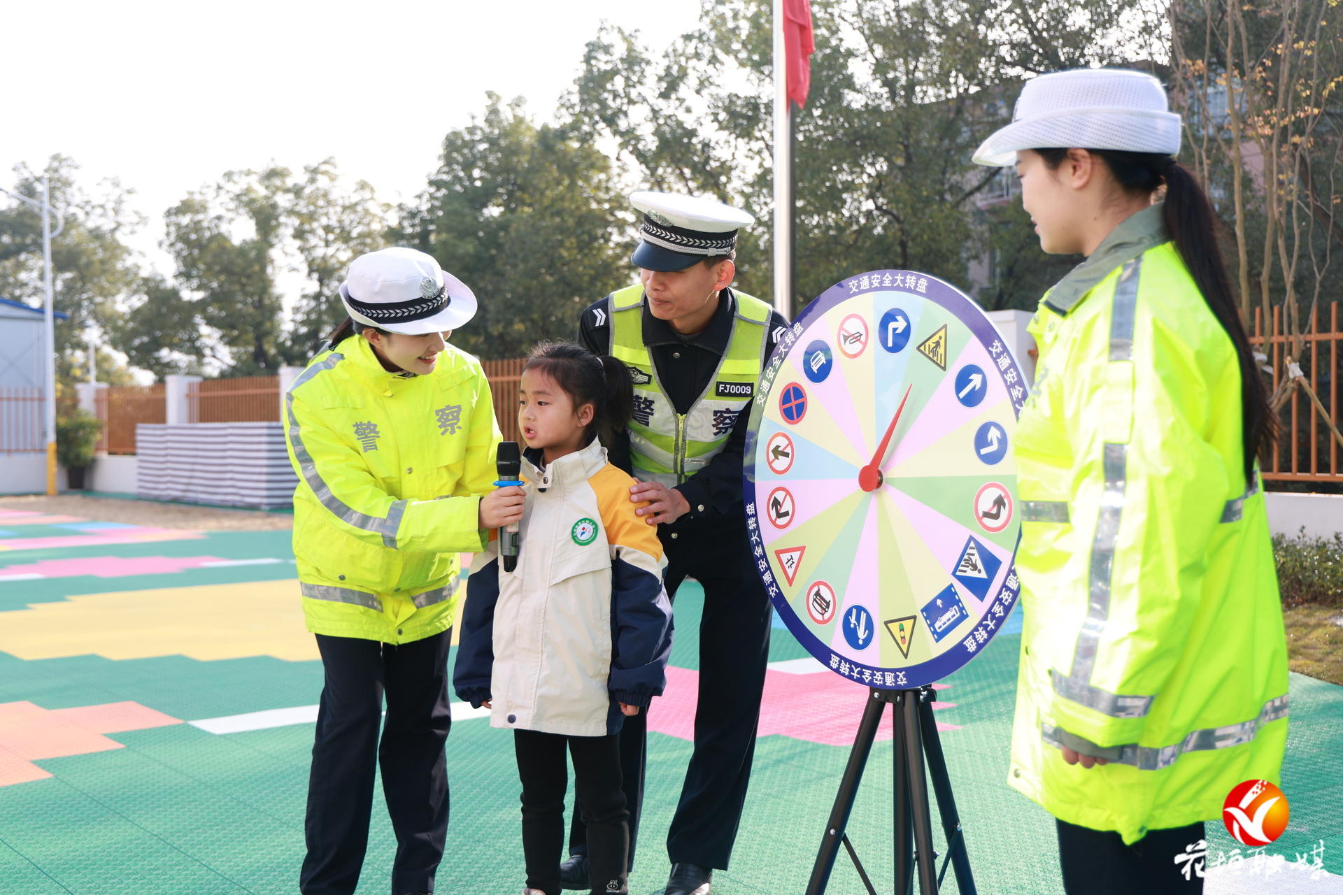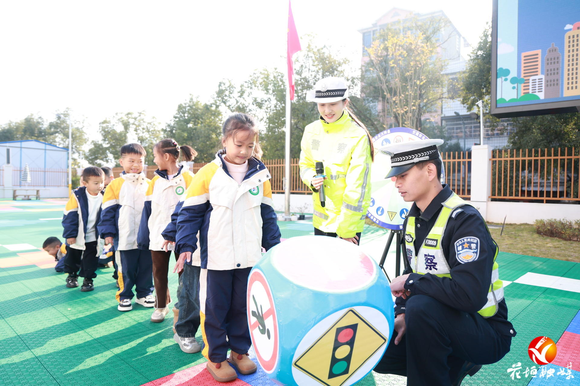 交警还利用“交通标志大转盘”“交通标志骰子”等色彩丰富的教具,激发孩子们的学习兴趣。“我知道!这是斑马线,要走这里!”“红色圆圈代表禁止!”在轻松愉快的游戏互动与问答中,孩子们踊跃参与。交警为积极回答问题的小朋友赠送了交警小熊、定制水杯、儿童安全头盔等纪念品,鼓励他们争做文明交通的小小践行者和宣传员,把学到的安全知识带回家中,让交通安全意识深深扎根。