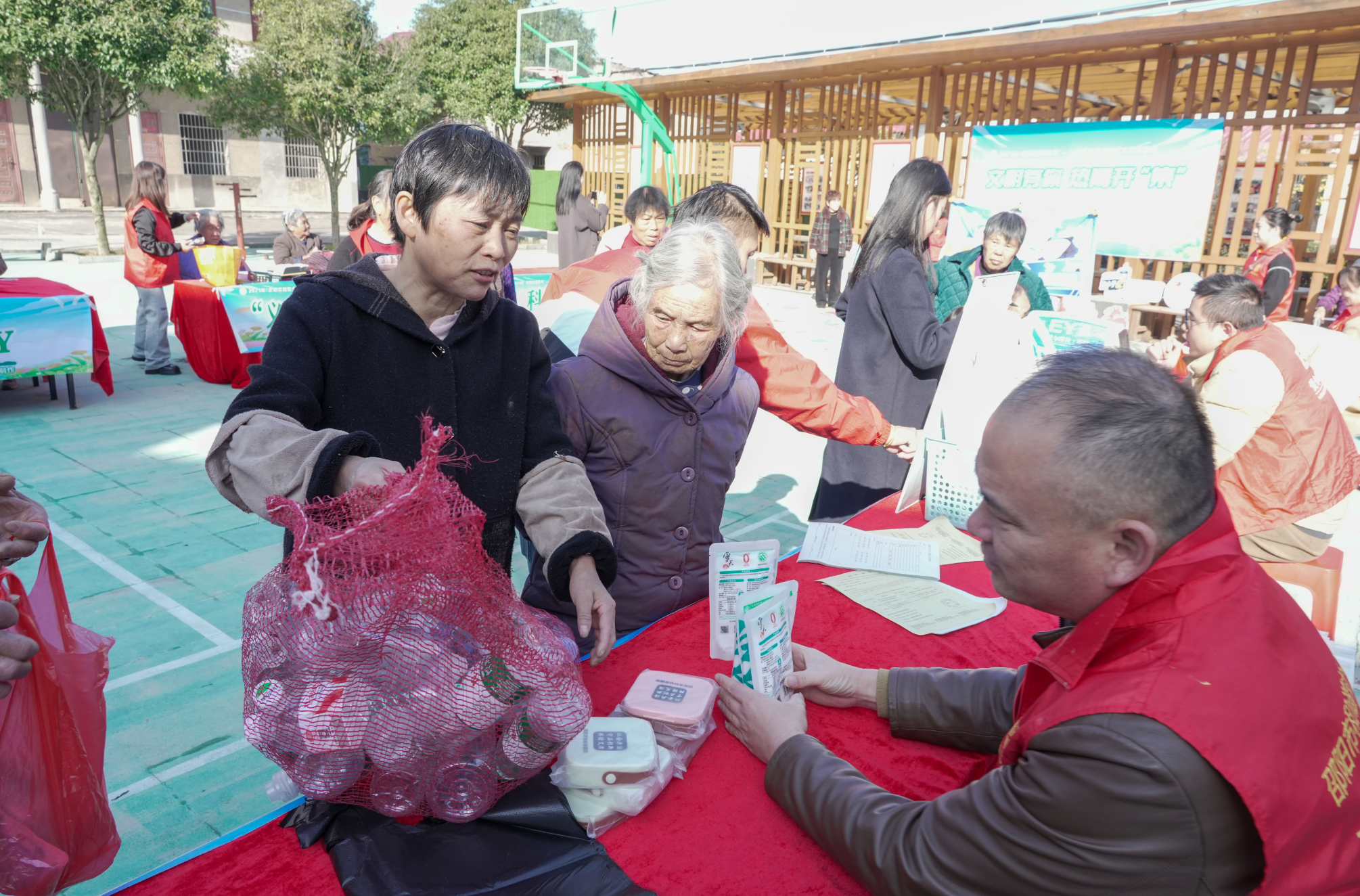 “‘瓶’什么都给我”摊位前,居民们用积攒的废旧塑料瓶兑换小礼品。“既能环保又能换东西,这活动太实在了!”一位阿姨笑着说。