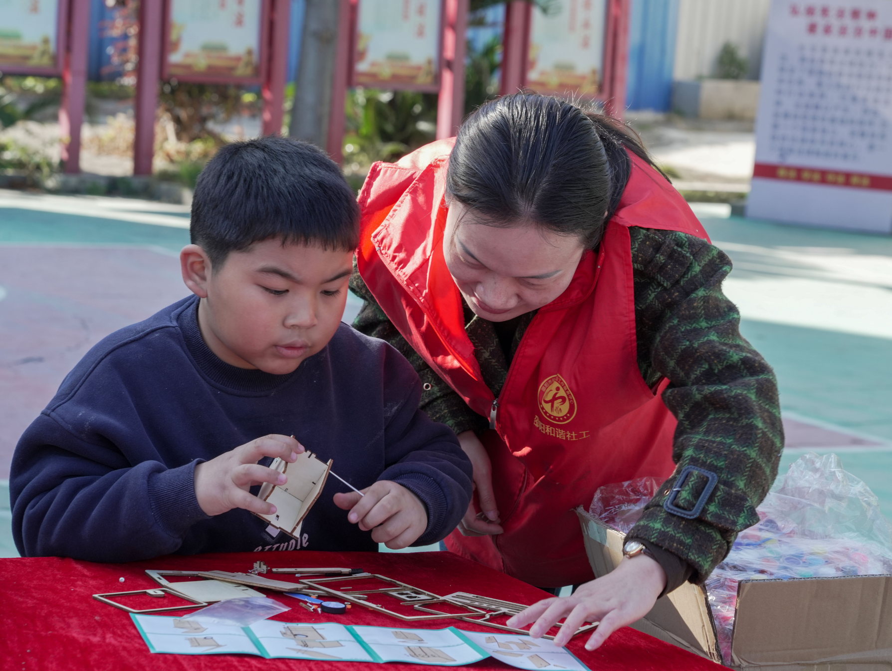 在巧手DIY环保垃圾桶制作区,孩子们和志愿者一起利用废旧纸盒、瓶罐等材料,制作出一个个创意十足的“环保垃圾桶”。
