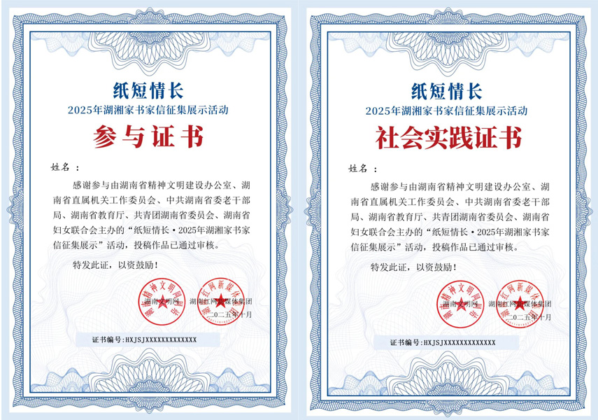 1、符合征集要求的手写/电子家书经审核发布后,参与者登录“文明万博manbetx官网:”微信公众号或红网时刻新闻客户端,领取活动参与电子证书,学生群体可领取省级社会实践活动电子证书。